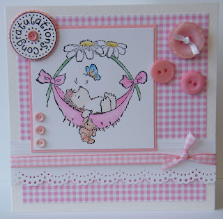 I dug deep into my Penny Black stamps and came up with this one. My favourite-ish - well - one of many I guess. And I always turn it into a baby card. The Congratulations is a stamp from Cuddly Buddly with a brad in the middle. Martha Stewart Doily Lace punch, and a few buttons - yeah - a few. Ribbon from stash. Papers - well I don't know - It'll be a print out from somewhere - Crafters Companion I think.